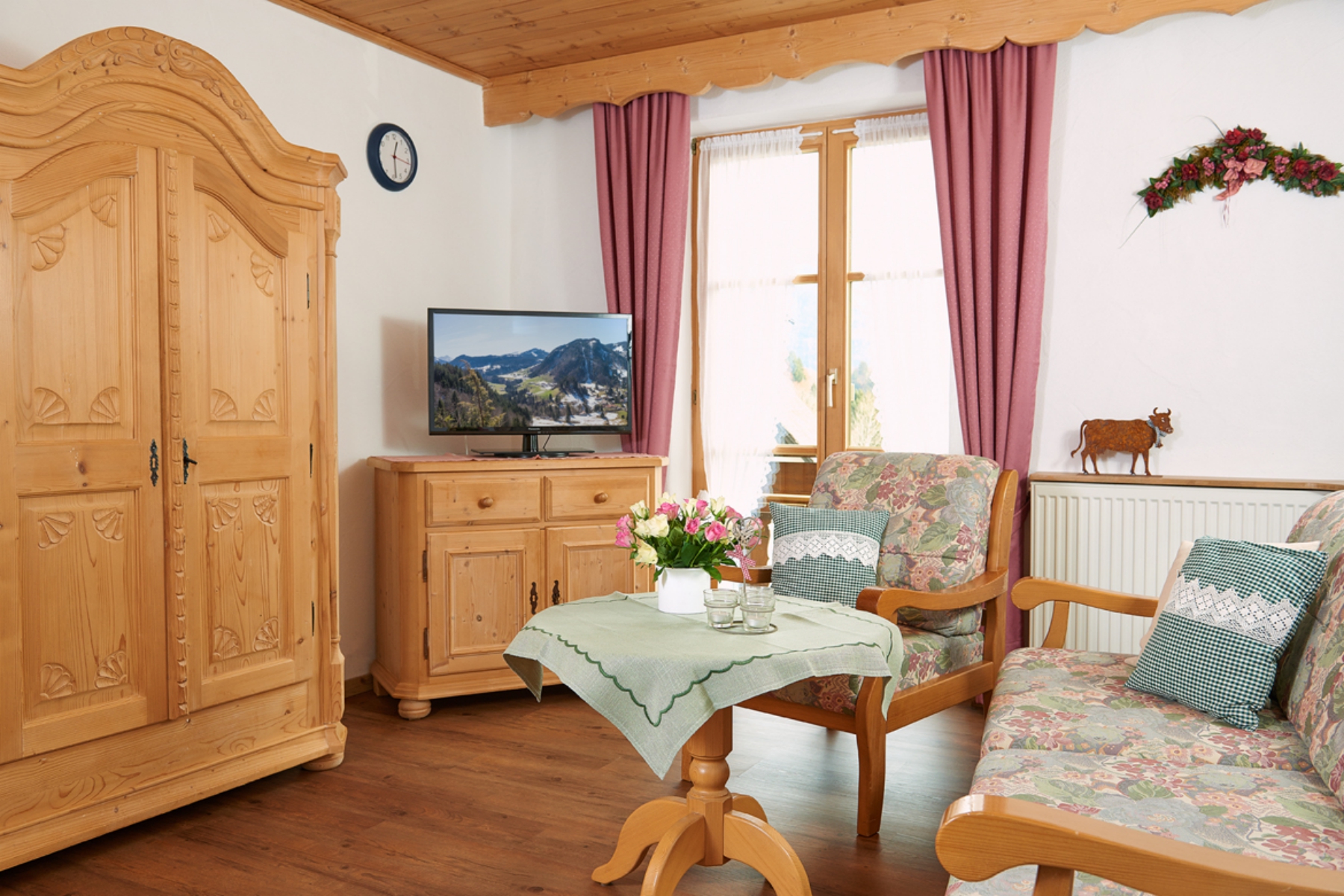 Unsere Ferienwohnung Veilchen ist ganz im Landhausstil eingerichtet, mit viel Holz und in zarten Farben. Mit ihren 40m² Wohnfläche ist sie ideal für einen Urlaub für zwei Personen. Sie verfügt über ein großzügiges Wohnzimmer mit Sofa, Sesseln, Flachbild-TV mit SAT-Empfang. Ebenfalls dort untergebracht ist eine Essecke, die sich gleich am Zugang zur vollausgestatteten Küche befindet.